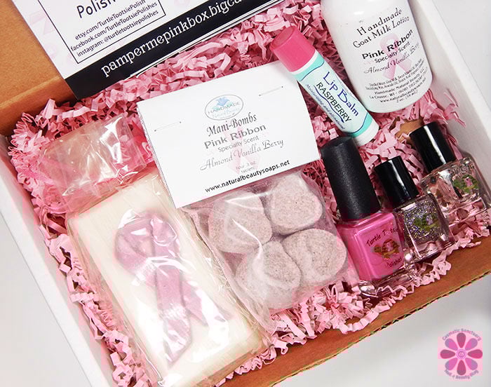 A collaboration box between Turtle Tootsie Polishes and Handmade Natural Beauty. Included are 2 polishes, a scented top coat, a glycerin soap, goat milk lotion, mani bombs and a lip balm. For more details, visit the Collection Contents page. A portion of proceeds donated to cancer research. For pre-sale Sept. 20-Oct. 4, 2015. Orders placed Sept. 20-October 4 to ship Oct. 5-7. Orders placed Sept. 28 to Oct. 4th to ship Oct. 12-14.